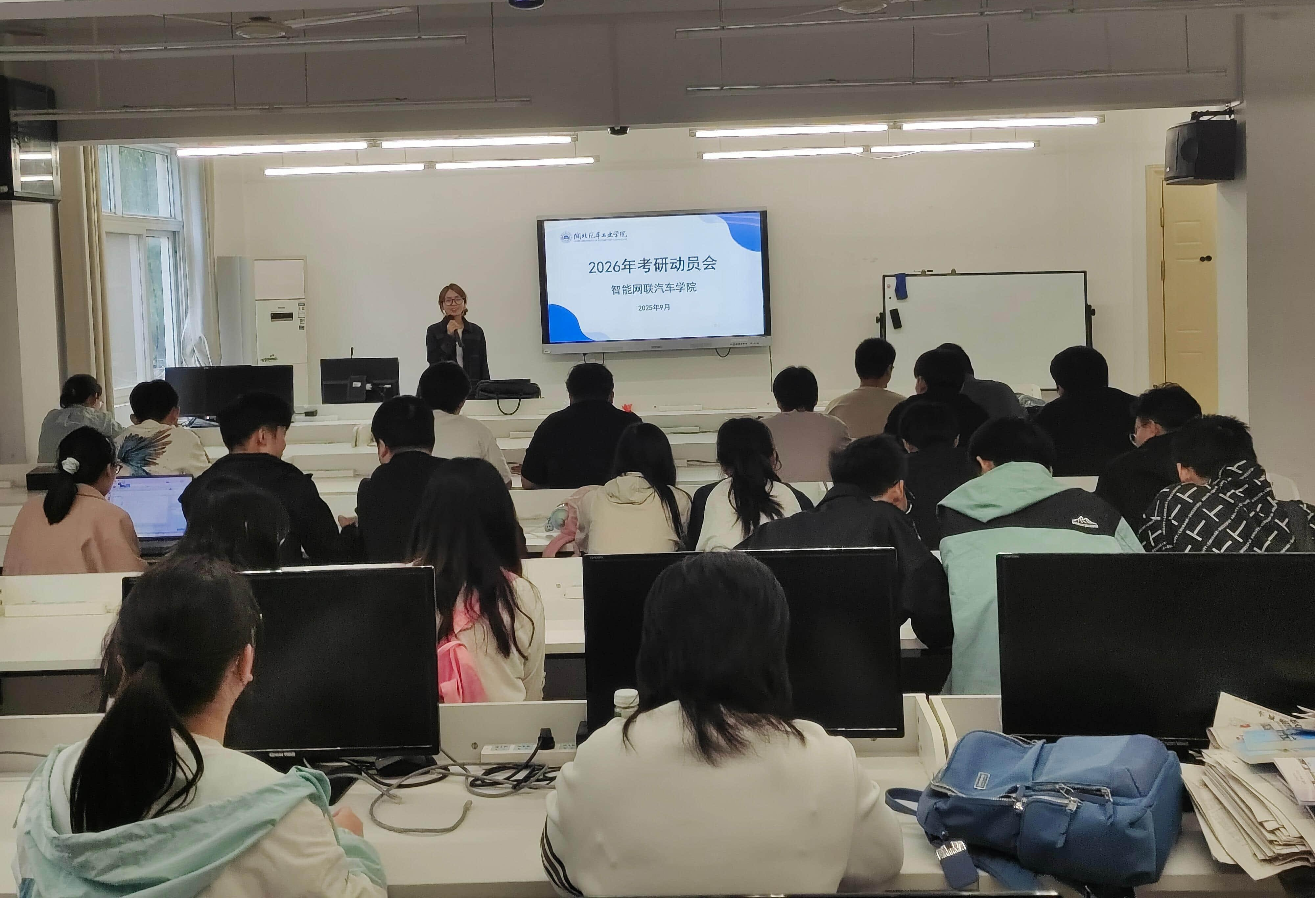 本网讯(图 陈儒昊/文 余婧靓)为进一步鼓励2026届本科毕业生明确考研目标、明晰备考方向,帮助学生科学制定复习计划,积极投身考研备考工作,9月25日下午17时,智能网联汽车学院在学院三楼教室召开 2026 届考研动员暨规划指导大会。学院2022级全体考研学生参会,大会由余婧靓老师主讲,为即将开启考研征程的学子们送上“备考指南”。