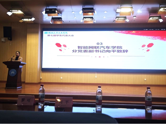 (文/喻文婕 图/智网学院新媒体中心)10月13日,智能网联汽车学院第七次学生代表大会在图书馆报告厅隆重举行。院党委副书记向平,学工办主任杨耀钧、团委书记喻文婕、辅导员罗可、贾文峰及全院学生代表参加了本次大会,会议由余泽玮主持。