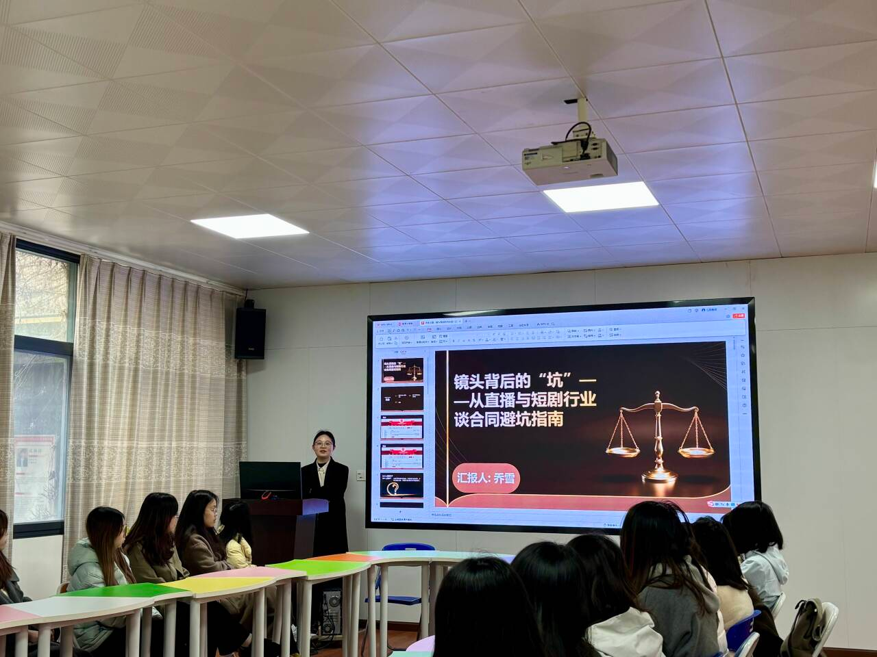 本网讯(文/图 乔雪 缪学笛)为切实提升我院女大学生的法律素养与风险防范意识,增强其在兼职实习及未来职业发展中的自我保护能力,3月13日,学院于“一站式”心理中心团辅室成功举办了一场以“镜头背后的‘坑’——从直播与短剧行业谈合同避坑指南”为主题的普法专题讲座。讲座由具有法学专业背景的辅导员乔雪老师主讲,学院各年级女生代表积极参与。