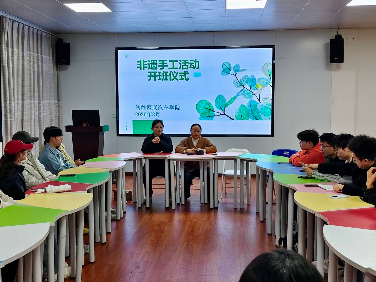 本网讯(文/图 缪学笛)3月23日下午,智能网联汽车学院在“一站式”学生社区心理团辅中心举办非遗手工开班仪式,将非遗传承与劳动教育课程深度融合。活动由乔雪、缪学笛两位老师主讲,25级学生代表参与。