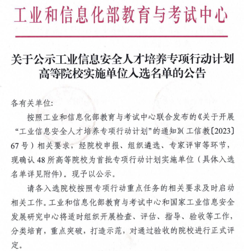 为贯彻落实《工业和信息化部关于加强和改进工业和信息化人才队伍建设的实施意见》(工信部人(2022〕138号)文件精神,优化工业信息安全产业人才发展生态,系统推进工业信息安全产业人才培养与评价工作,在工业和信息化部教育与考试中心联合国家工业信息安全发展研究中心共同发起了“工业信息安全人才培养专项行动计划”。