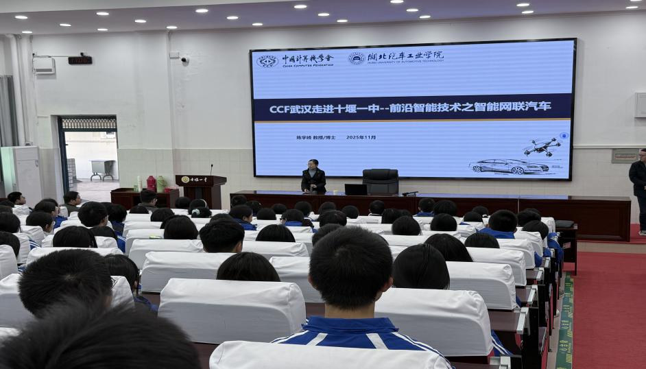 2025年11月21日下午,由中国计算机学会(CCF)主办、CCF武汉与湖北汽车工业学院承办的“CCF武汉走进十堰一中——前沿智能技术之智能网联汽车”活动在湖北省十堰市一中顺利举行。CCF武汉执委、湖北汽车工业学院智能网联汽车学院院长陈宇峰教授、院长助理陈西亮博士、学工办主任杨耀钧老师、辅导员余婧靓出席活动,十堰一中200多名师生参加此次活动。