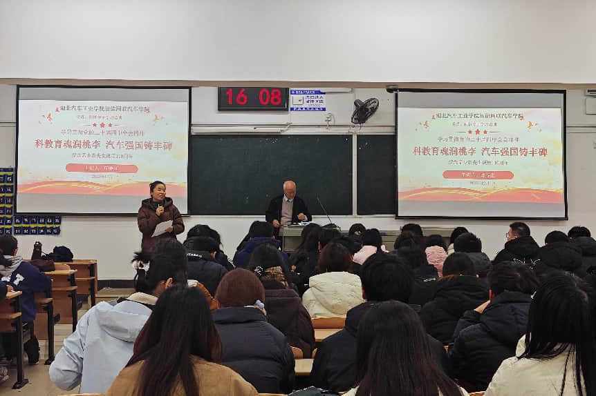 本网讯(文 余婧靓/图 马成涛)为纪念孟少农先生诞辰110周年,12月22日下午,湖北汽车工业学院智能网联汽车学院以“科教育魂润桃李 汽车强国铸丰碑”为主题,举办党员、积极分子主题党课。邱春正老师主讲,党委副书记向平主持。