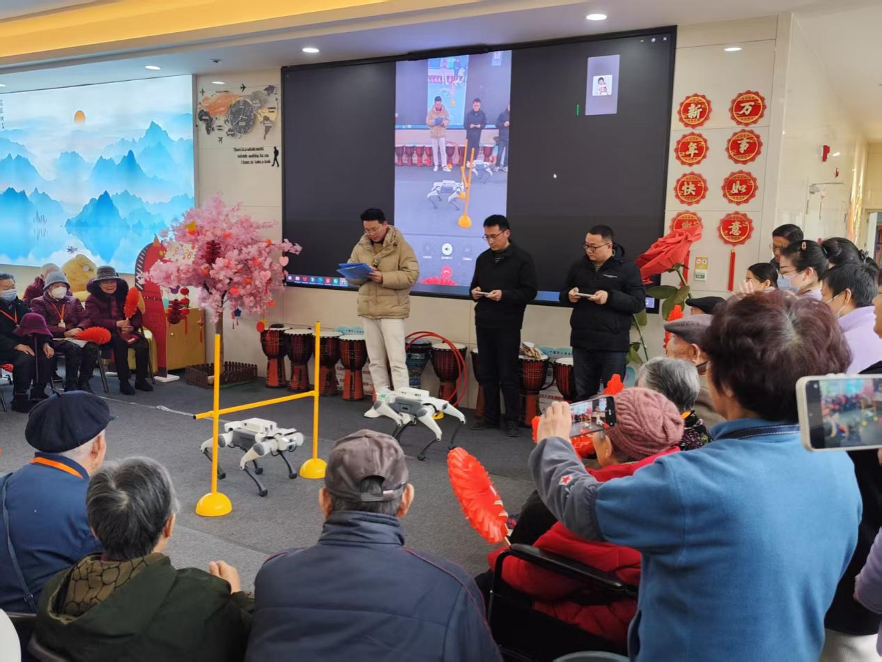 活动现场暖意融融,CCF成员带来的智能机器狗一亮相便成为焦点。在成员精准操控下,机器狗灵活完成握手、作揖、旋转跳舞等动作,还能灵敏响应老人简单语音指令,憨态可掬的模样引得老人们眉眼舒展、笑声不断,不少老人主动伸手触摸、合影互动。陈宇峰院长与老人们促膝长谈,细致询问饮食起居与健康状况,倾听心声并叮嘱保重身体。成员们分工陪伴老人闲话家常,手把手教老人操控机器狗,让老人们近距离感受科技的魅力与便捷,温馨氛围感染全场。