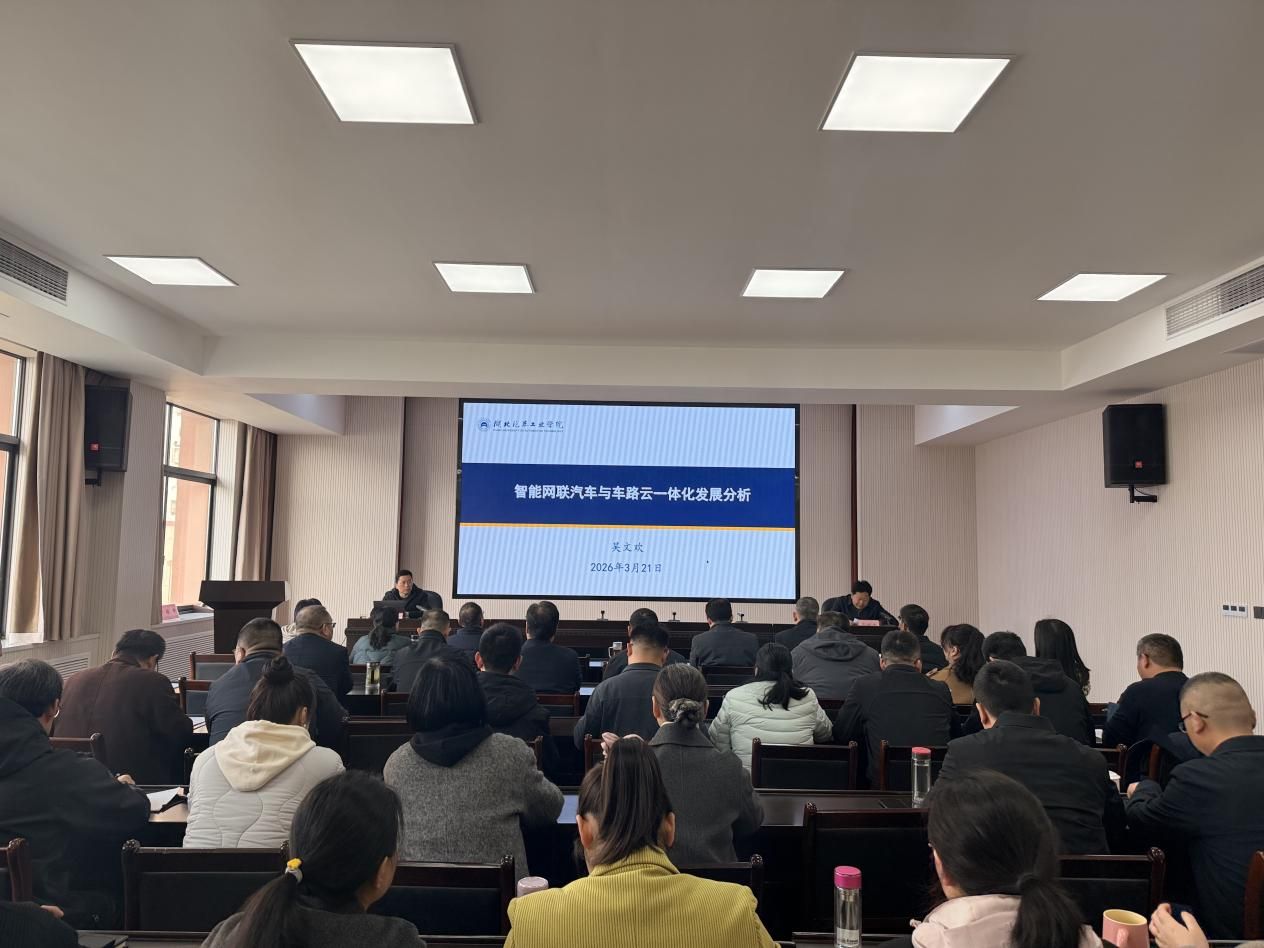 本网讯(文/图吴文欢)3月21日上午,十堰市经信局2026年“周末业务知识培训”第四期讲座在市经信局会议室成功举办。本次讲座以“智能网联汽车与‘车路云一体化’发展现状与未来趋势”为主题,特邀我校智能网联汽车学院吴文欢副教授担任主讲嘉宾,市经信局全局干部职工参加培训学习。